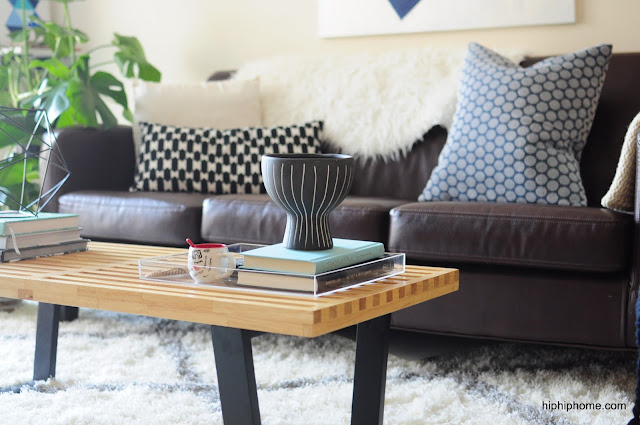 Ohh, what a nice refresh! okay, so 1. i LOVE that coffee table. What a score! 2. Nice job on the art work...I've been there and tape and canvas is the easiest approach to DIY art! 3. The blanket...so comfy...want it! As for above the TV, that's a tough one...if you want to stay clean and minimalist I would say add nothing. If you must have something there, maybe a row of small prints, or if you like saying decals, maybe something there? Other option is to mount the TV. NICE JOB though...enjoy your new space!