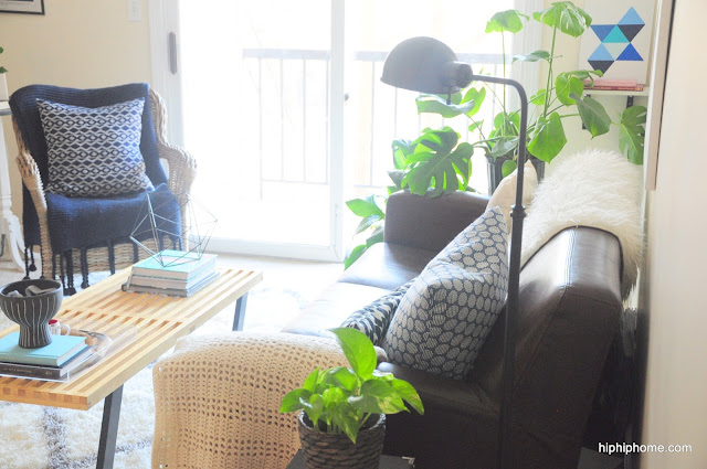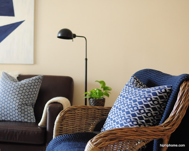 Both the blue pillows are new, I made them using fabric from Joanns. I don't have a sewing machine and I usually use Fabric Glue for my pillows. But this time, I hand stitched it. And unless you have the patience of a Kindergarten teacher, I don't recommend it. I am so hung over from the experience that I can't even look at another needle.