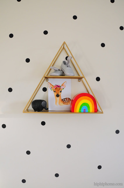 The little triangle shelf is Project 62 from Target. It is a pretty small shelf, and might not work in every room, but the scale is right here. I love filling it up with little trinkets. The rainbow is actually a piggy bank - how stinking cute is that! The whimsical deer is a free printable which you can get here.