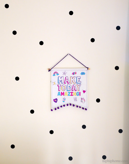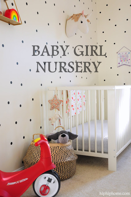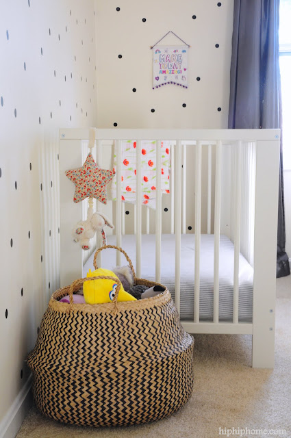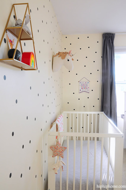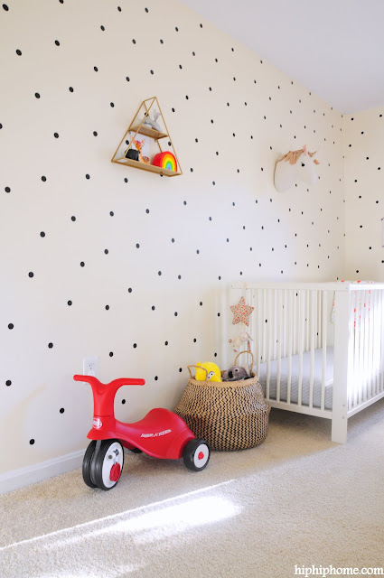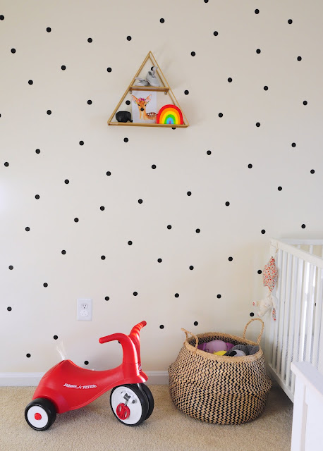 I really wanted to add some pattern to her side of the wall. I had a few options in mind - stripes, contact paper, temporary wallpaper and decals. I finally decided to do these tiny 1 inch polka dots. They add some pattern to the wall but doesn't overwhelm the room. It also makes the area look much bigger than it actually is. They are pretty easy on the wallet so no regrets there!